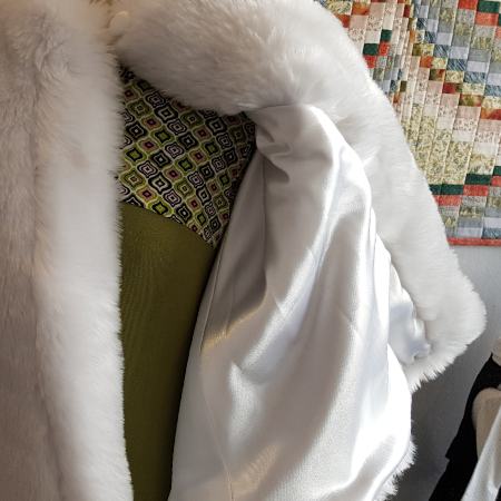 La cape est en fausse fourrure, haute densité qualité très douce, très difficile à distinguer de la vraie fourrure au toucher. Longueur du poil 2,8cm. Elle est entièrement doublée de satin blanc. Fermoir par cordonnet et bouton recouvert satin.